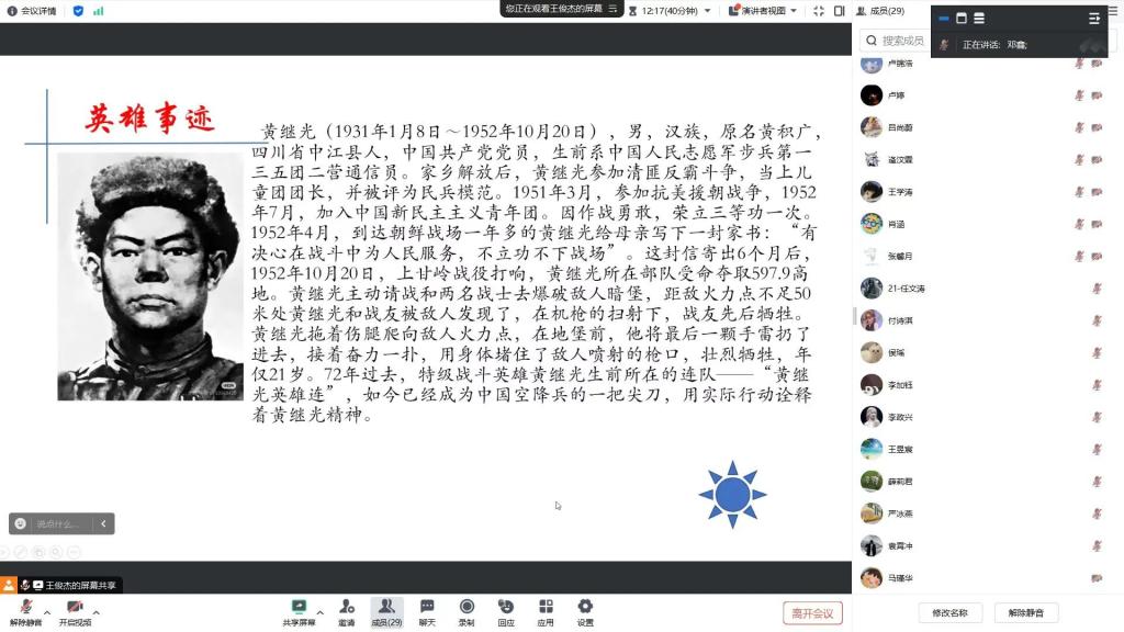 为大力弘扬红色文化,传承革命先烈革命精神,1月15日卓越党支部于线上开展了“烽火印记・卓越传承”革命故事分享会(第5期)。本期故事分享会聚焦中国人民志愿军英雄代表黄继光,卓越党支部成员全体参加,共同感受英雄的力量。