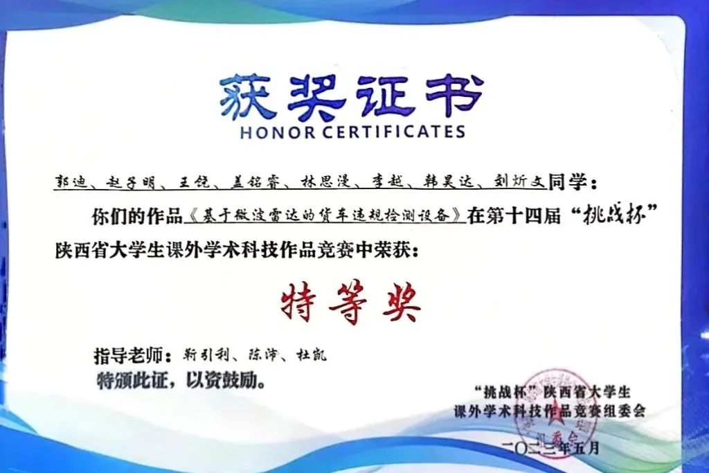 积极响应团省委和校团委号召,广泛组织学生参与本届“挑战杯”竞赛。由学院靳引利教授指导、本科生郭迪、赵子明、王饶、盖铭睿、林思漫、李越、韩昊达、刘炘文同学完成的作品《基于微波雷达的货车违规检测设备》荣获第十四届“挑战杯”陕西省大学生课外学术科技作品竞赛特等奖,实现了学院在此项赛事上的历史性突破,团队成员赵子明同学代表学校在颁奖仪式现场进行路演展示。