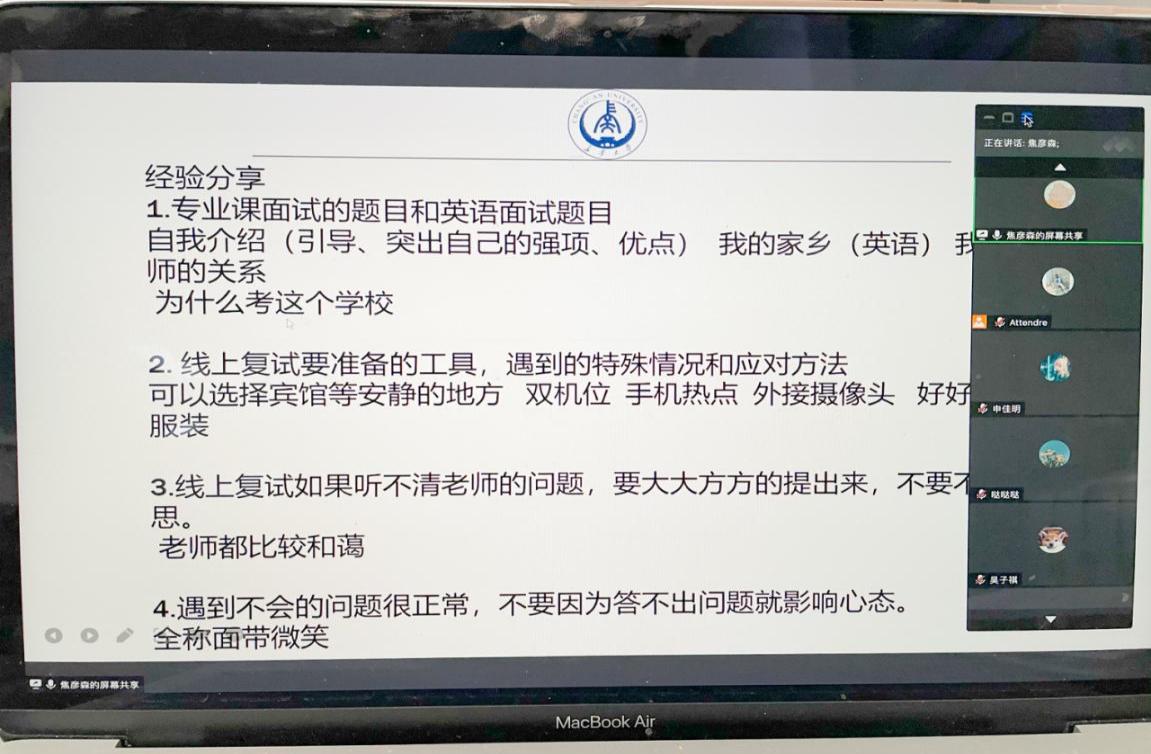 九名在读硕士研究生结合自身经历,分享了自己在所在学校的复试经验。其中,西北工业大学控制科学与工程专业研究生冉汉阳同学针对专业复试科目、英语面试及联系导师等方面的细节做了讲解。