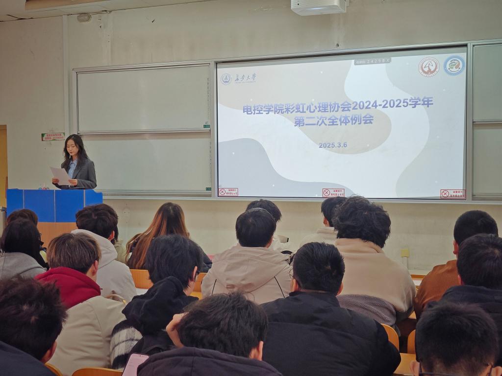 彩虹心理协会(以下简称心协)于WX4203教室举行了2024-2025学年第二次全体例会。院党委副书记兼二级心理辅导站站长高婷婷、心协指导老师张馨月以及心协全体成员参加本次会议,会议由宣传部志愿者郭湘主持。