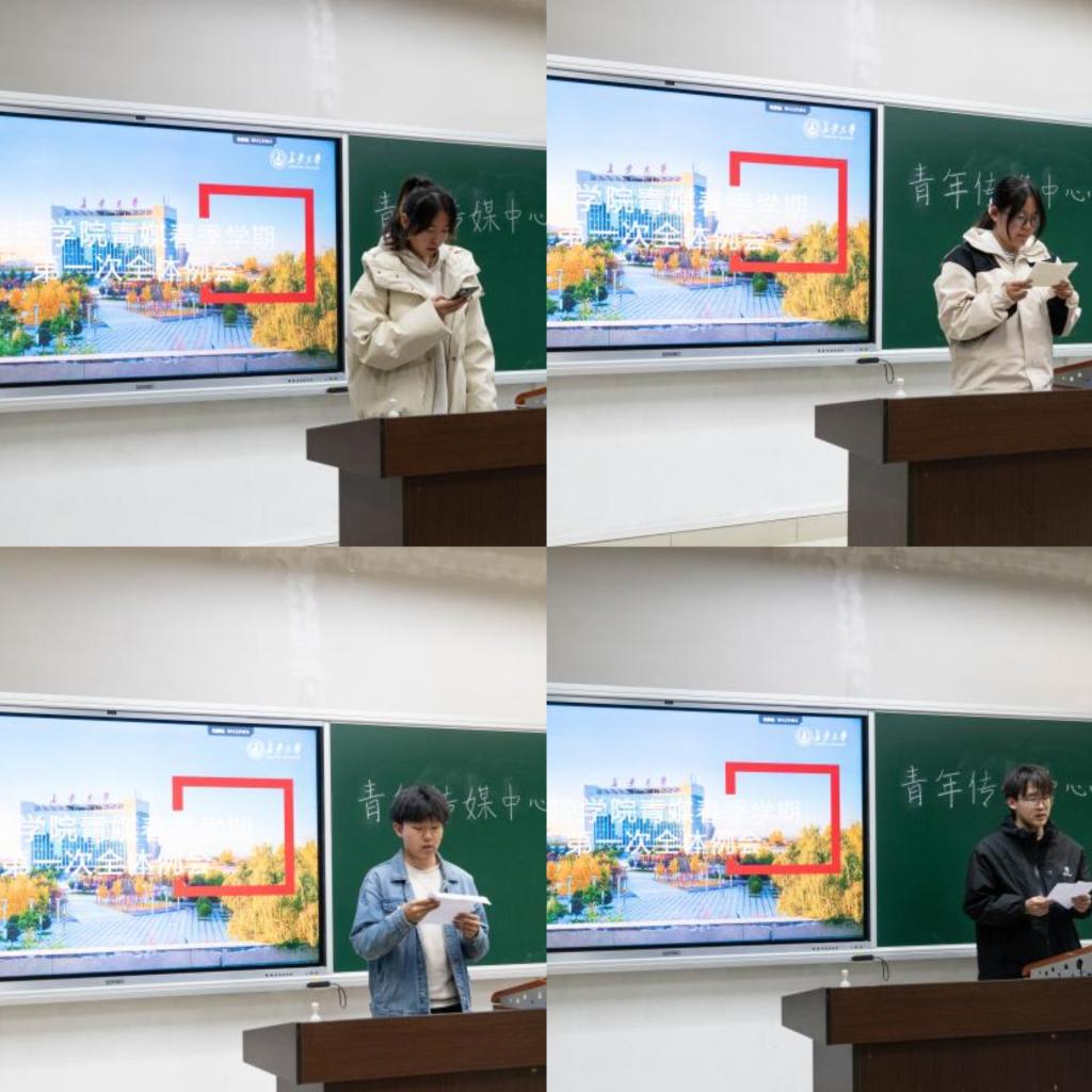 青媒于3月14日晚在北校区wm1105开展第一次全体例会,学院党委副书记高婷婷、团委书记李慧、青年传媒中心指导老师王佩佩及青媒全体成员参会。会议由秘书处志愿者潘祖颖主持。