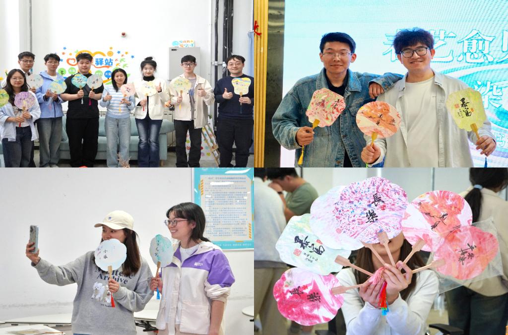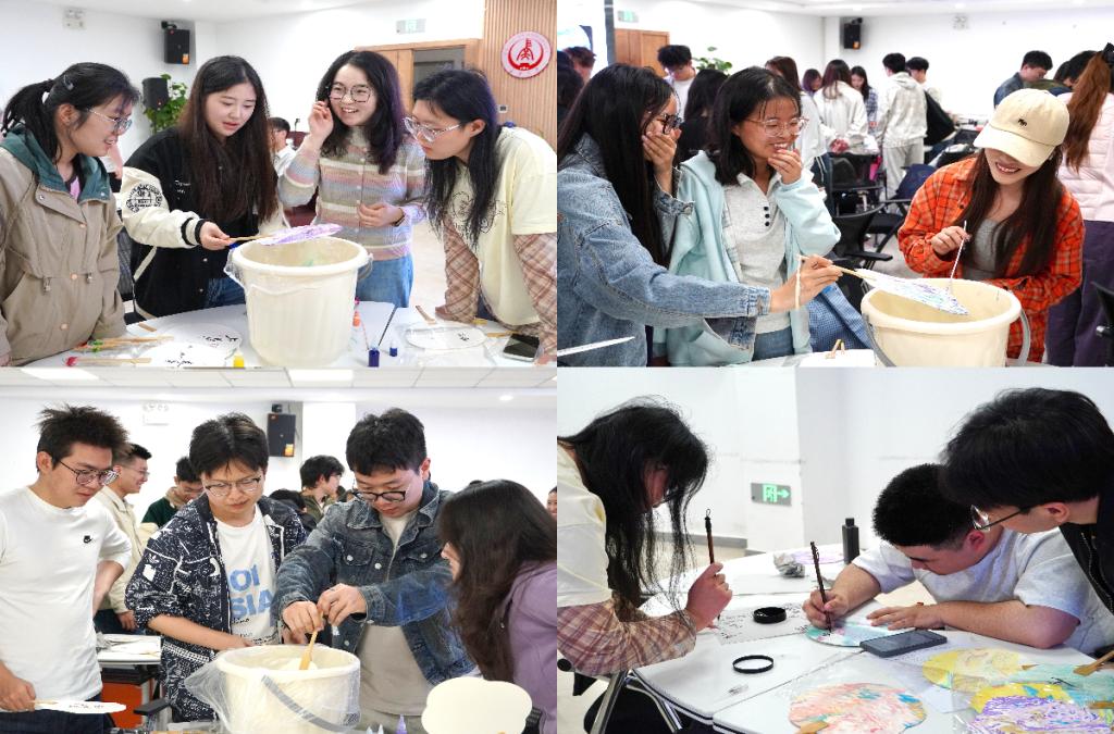 实际操作环节,同学们专注地观察颜料在水面的扩散与交融,现场氛围温馨而治愈。大家不时交流自己的色彩构思与拓印心得,分享创作中的“小意外”与“小惊喜”,欢声笑语此起彼伏。现场设置了书法写字服务,心协工作人员帮助同学们在书签或团扇上题写寄语或暖心短句,让每一件作品更添温度与个人印记。活动最后,同学们互相交换作品,送出自己“染”下的一刻,也收获了他人眼中的那片水纹,在互动中完成了“看见与被看见”的美好体验。