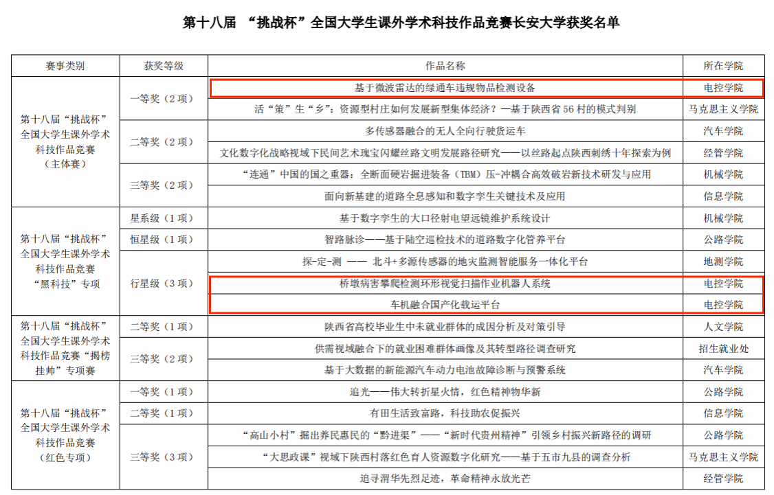 靳引利教授等指导、本科生郭迪等完成的《基于微波雷达的绿通车违规物品检测设备》项目荣获第十八届“挑战杯”全国大学生课外学术科技作品竞赛主体赛一等奖,实现了学院历史性突破;由王会峰教授指导、研究生杜浩等完成的《桥墩病害攀爬检测环形视觉扫描作业机器人系统》、黄鹤教授指导、研究生谢飞宇等完成的《车机融合国产化载运平台》荣获“黑科技”专项赛行星级奖项。