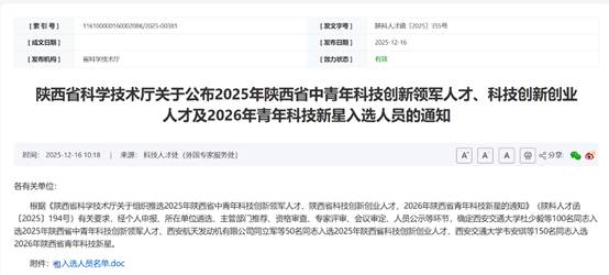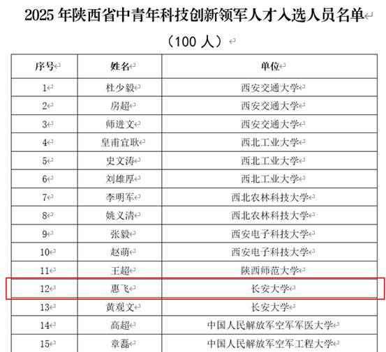 近日,陕西省科学技术厅发布了《关于公布2025年陕西省中青年科技创新领军人才、科技创新创业人才及2026年青年科技新星入选人员的通知》(陕科人才函〔2025〕355号),成人网 惠飞教授入选2025年陕西省中青年科技创新领军人才。